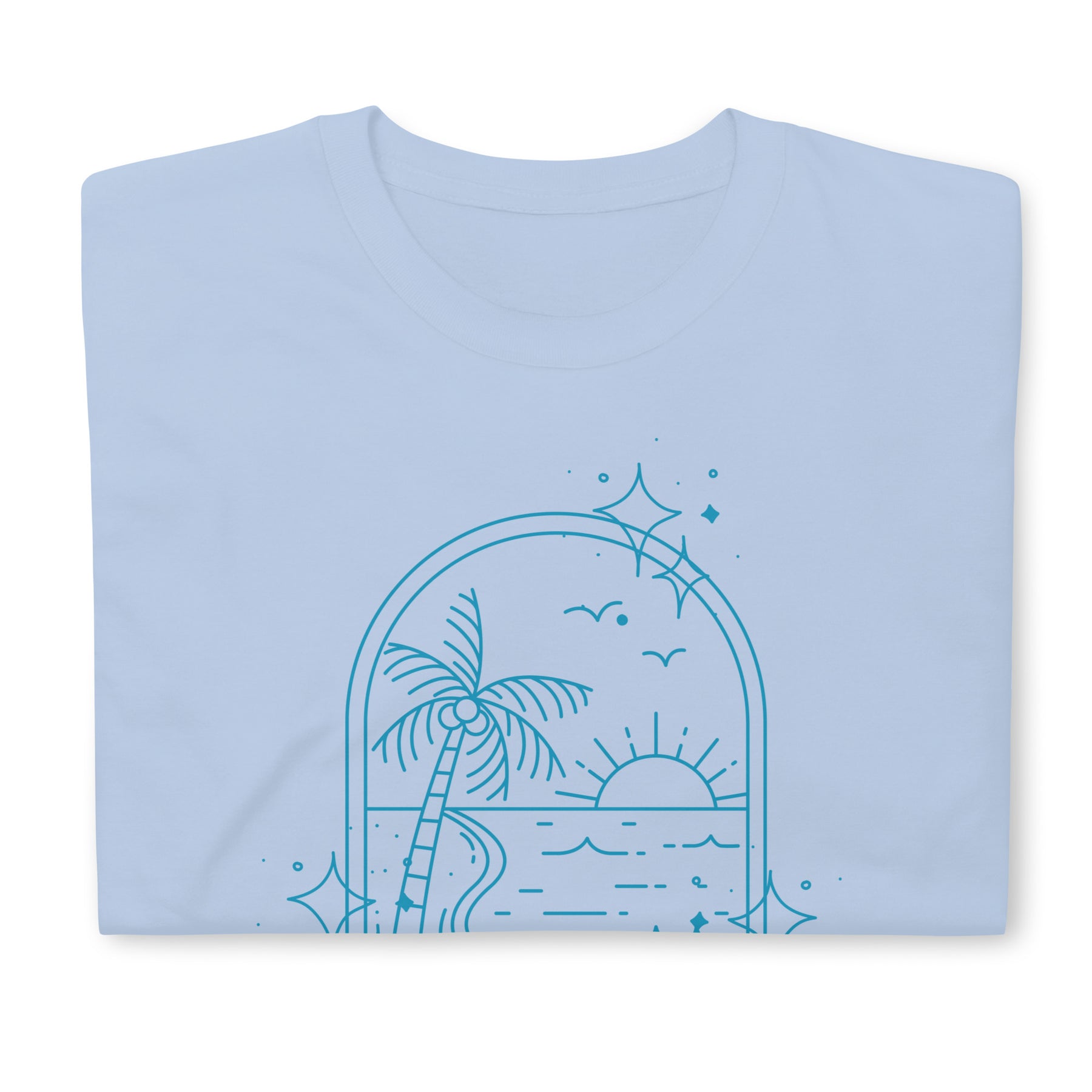 Close-up of folded light blue beach tee with palm tree, sun, and star details