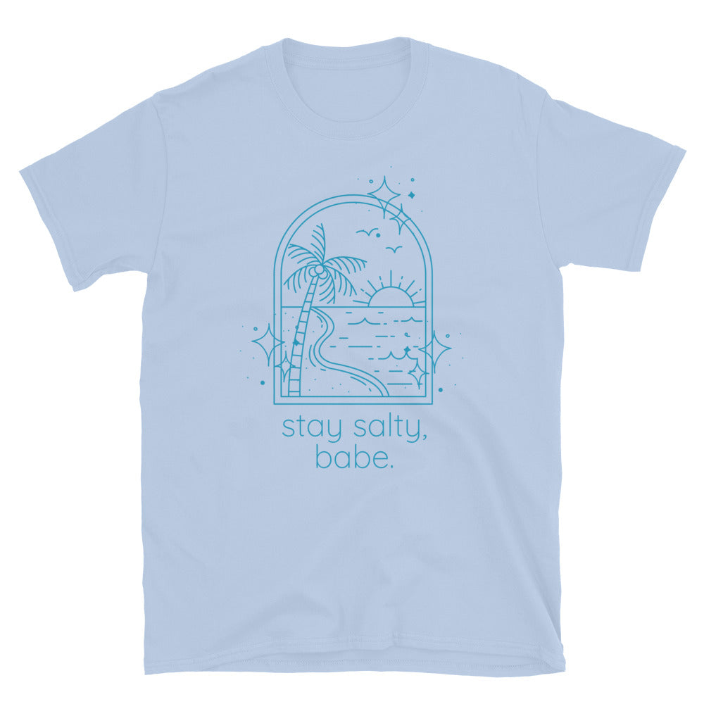 Light blue women’s graphic t-shirt with beach scene and text that reads "stay salty, babe" laid flat on white background