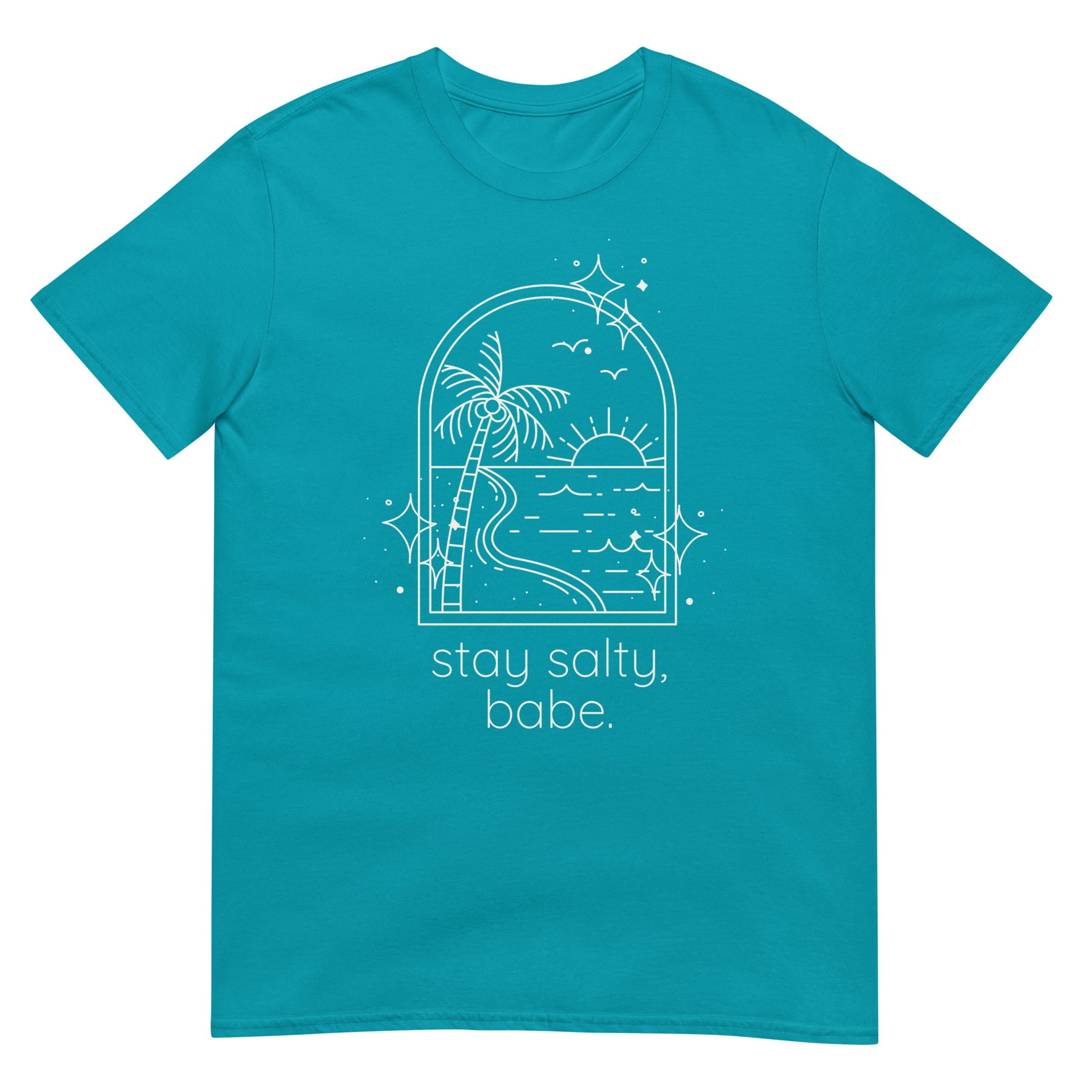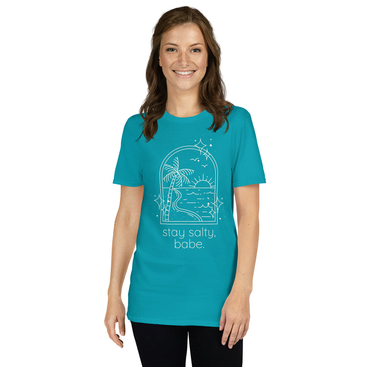 Tropical blue “Stay Salty, Babe” beach graphic tee on female model from Jade Street Market