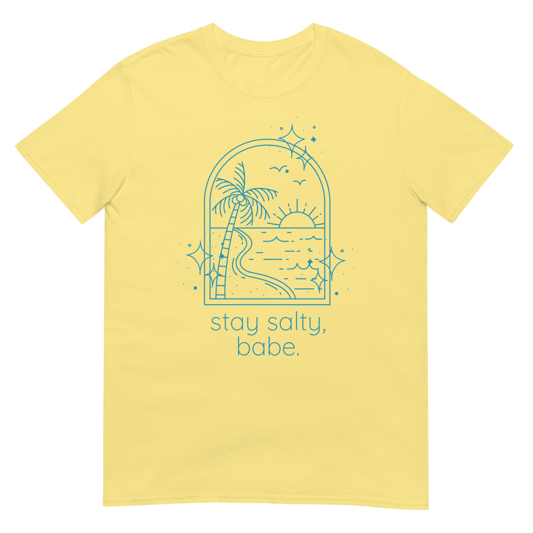 Woman in in soft yellow “Stay Salty, Babe” tee with bright blue image and text