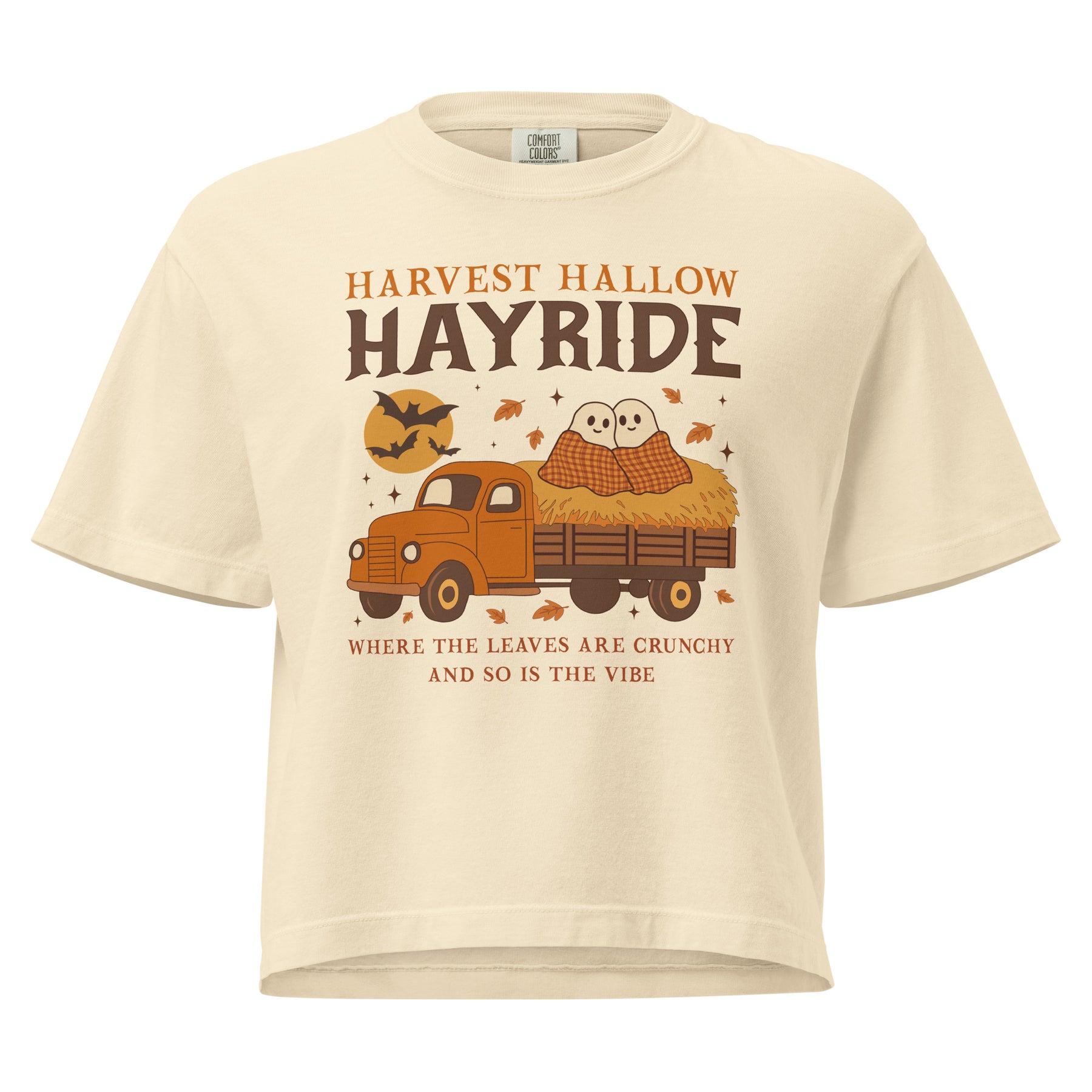 It’s giving small-town Friday night nostalgia—the good kind. The “Harvest Hallow Hayride” tee nails cozy-fall energy with a flattering boxy cut that hits right at the waist. Cream base, golden tones, and two adorable ghosts snuggled up in the back of a farm truck...it’s everything you love about spooky season without the scary part.